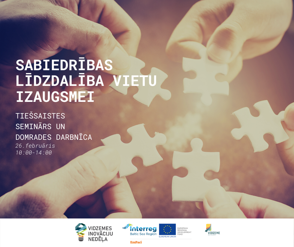 Vidzemes inovāciju nedēļas ietvaros 26. februārī no plkst. 10:00 notiks tiešsaistes seminārs un domrades darbnīca “Sabiedrības līdzdalība vietu izaugsmei”, kurā īpaši aicināti piedalīties publiskā sektora un kultūras jomas pārstāvji.