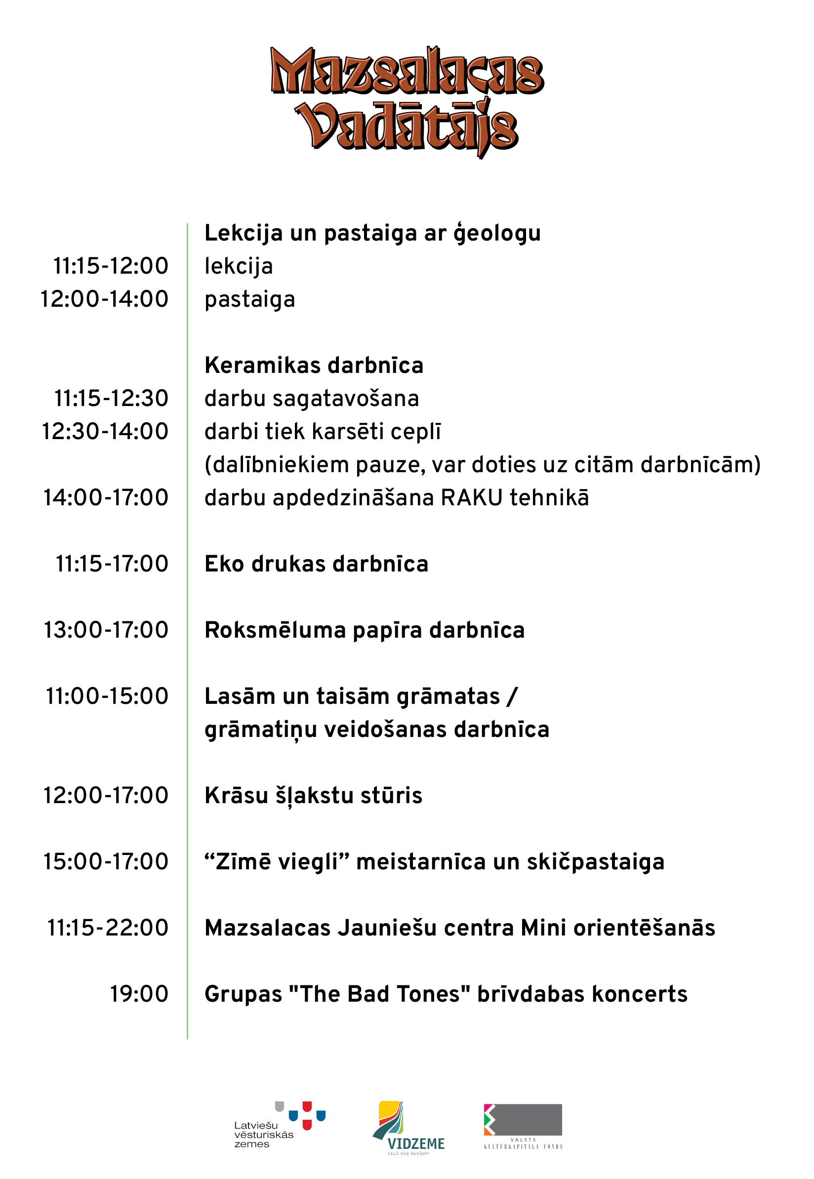 Visas dienas garumā festivāla bāzes vietā, sapņainajā Līču skolā, notiks RAKU keramikas cepļa kurināšana, kuru vadīs keramiķe Inuta Graudiņa sadarbībā ar Vidusmežu keramiku, Zīmē viegli skičpastaiga Dainas Domašūtes vadībā, bērnu grāmatu darbnīca ar bibliotekāri Lieni, roksmēluma papīra liešana mākslinieces Ilzes Dilānes vadībā, tekstilmākslinieces Lailas Stradas ekodrukas darbnīca, pastaiga un ekskursija ar ģeologu Daini Ozolu, krāsu šļakstu stūris, Mazsalacas Jauniešu centra mini orientēšanās un dažādas citas radošas un sportiskas aktivitātes sacensību līdzbraucējiem un festivāla viesiem. Pēc apbalvošanas festivāla dalībniekiem būs iespēja nogaršot slavenos Ēdiendara burgerus, baudīt atspirdzinošus dzērienus un klausīties dabas un blūza iedvesmotu psihedēliskā roka kvarteta “The Bad Tones” dzīvās mūzikas koncertu, nesteidzīgi pavadot vasaras izskaņu Līču skolas liepu paēnī.