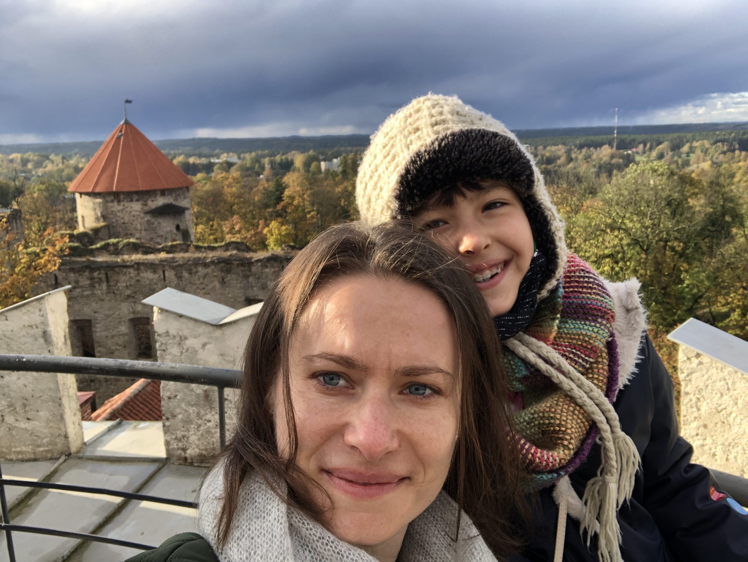 Santa Zvirbule ar meitu Cēsu pils dienvidu tornī. No S. Zvirbules privātā arhīva