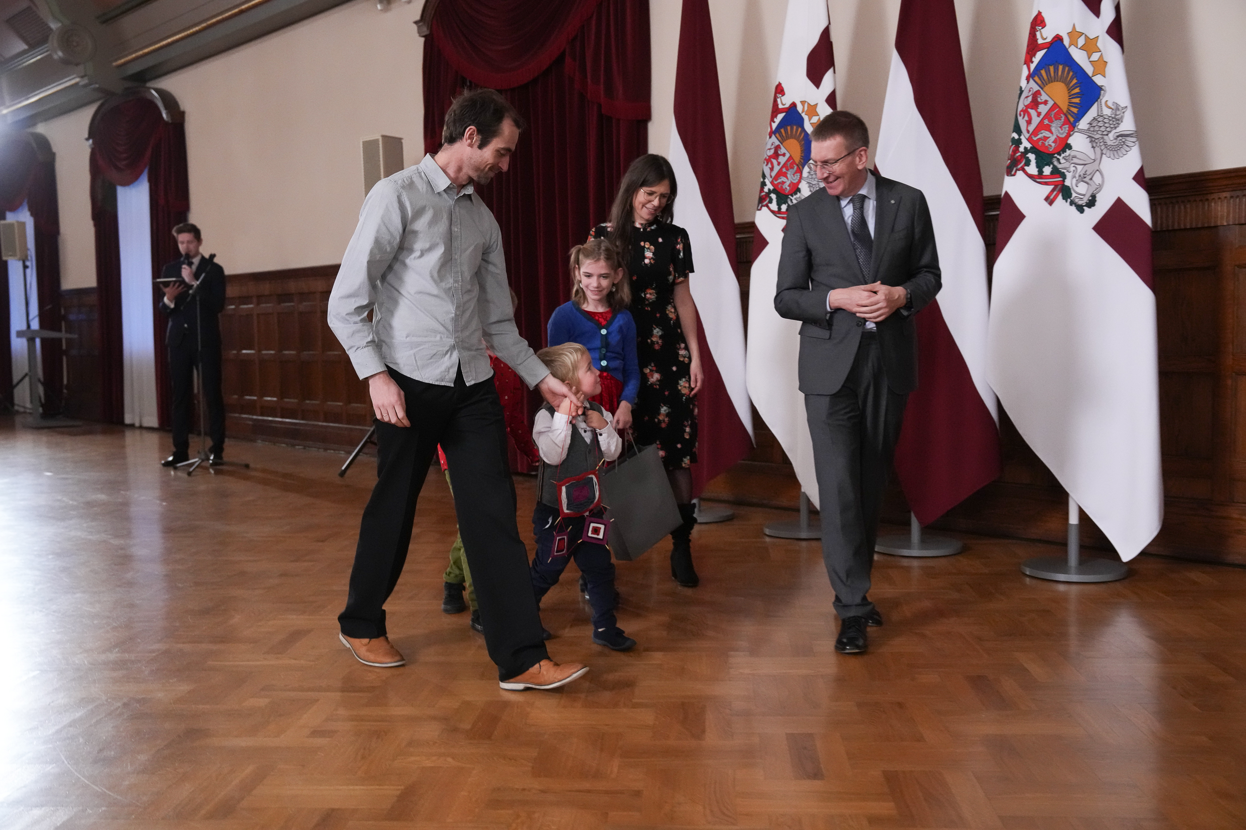 Prezidents uzrunā izcēla ģimeņu nozīmīgumu, sacīdams: “Jūs esat darījuši daudz, lai saviem bērniem dotu visu to labāko. Jūs vienmēr esat bijuši ļoti gādīgi vecāki. Es gribu teikt tiešām lielu paldies gan jums, gan visiem jūsu tuviniekiem, kuri jūs ir atbalstījuši, jo kuplas ģimenes mūsdienās nav pašsaprotama lieta. Man ir liels prieks un gods šodien kopā ar jums sākt svinēt Ziemassvētkus Rīgas pilī!”