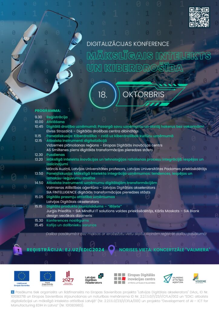 Pasākums tiek organizēts un līdzfinansēts no Eiropas Savienības projekta “Latvijas Digitālais akselerators” DAoL, ID Nr. 101083718 un Eiropas Savienības Atjaunošanas un noturības mehānisma ID Nr. 2.2.1.1.i.0/1/23/I/CFLA/002 un “EDIC: atbalsts digitalizācijai un mākslīgā intelekta attīstībai Latvijā” (Nr. 2.2.1.1.i.0/23/I/CFLA/001) un projekta “Development of AI – ICT for Manufacturing EDIH in Latvia” (Nr. 101083983).