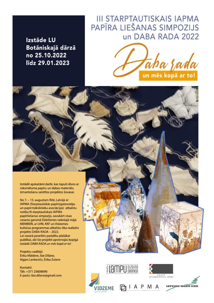 LU Botāniskā dārza Palmu mājas foajē no 2022. gada 25. oktobra līdz 2023. gada 29. janvārim būs skatāma izstāde “DABA RADA un mēs kopā ar to!”. Izstādes, kas gada tumšajā periodā ar no papīra gatavotiem gaismas objektiem izgaismo LU Botāniskā dārza izstāžu telpu, jau ir kļuvušas par skaistu tradīciju. Šogad izstādē apskatāmi darbi, kas tapuši šovasar divos ar roksmēluma papīra un dabas materiālu izmantošanu saistītos projektos. Abi projekti māksliniekiem piedāvāja iespēju eksperimentēt, ielūkoties daudzveidīgajā dabas iespēju un papīrmākslas pasaulē un realizēt savas radošās ieceres.