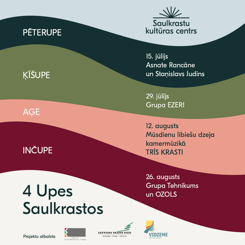 Saulkrastos šovasar izskanēs četri dažāda rakstura koncerti pie četrām Saulkrastu upēm. Atšķirīgi, gluži kā upes – Pēterupe, Inčupe, Aģe un Ķīšupe – katrs ar savu raksturu, straujumu un skaņas plūdumu, taču ar vienu kopzīmi – izskanam saulrietā un pie upes ietekas jūrā.