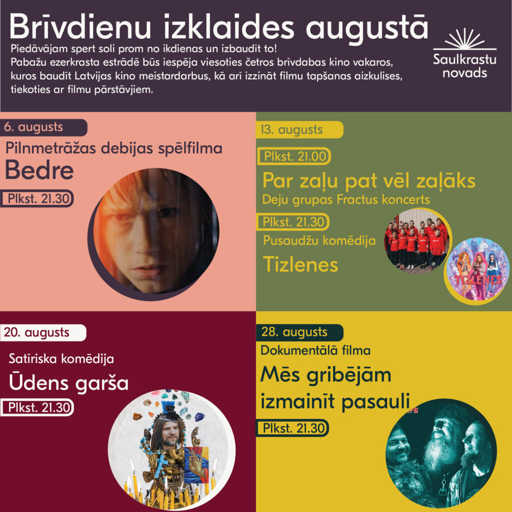 Saulkrasti aicina uz brīvdabas kino seansiem “Kino uz ezera” Pabažu ezera krastā, kur būs iespēja viesoties četros brīvdabas kino vakaros un baudīt Latvijas kino meistardarbus, bagātināt kino repertuāru ar jaunām, interesantām filmām un uzzināt filmu tapšanas aizkulises, tiekoties ar filmu pārstāvjiem. Piedāvājam 6. augustā noskatīties filmu “Bedre”, 13. augustā pusaudžu komēdiju “Tizlenes”, 20. augustā satīrisku komēdiju “Ūdens garša” un 28. augustā dokumentālo filmu “Mēs gribējām izmainīt pasauli”.