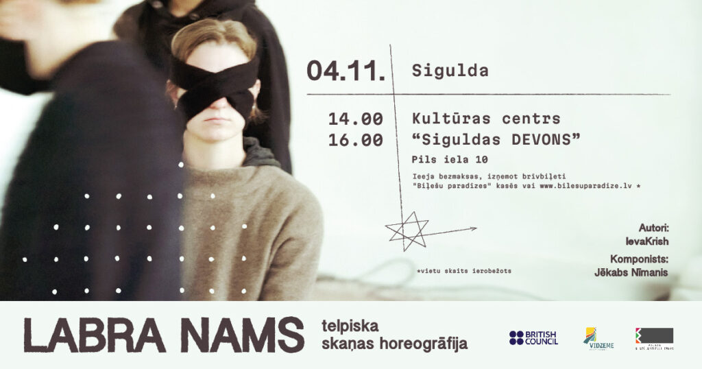 4. novembrī plkst 14.00 un 16.00 kultūras centrā Siguldas Devons varēs piedzīvot apvienības “IevaKrish” telpiskas skaņas horeogrāfijas izrādi “Labra nams.