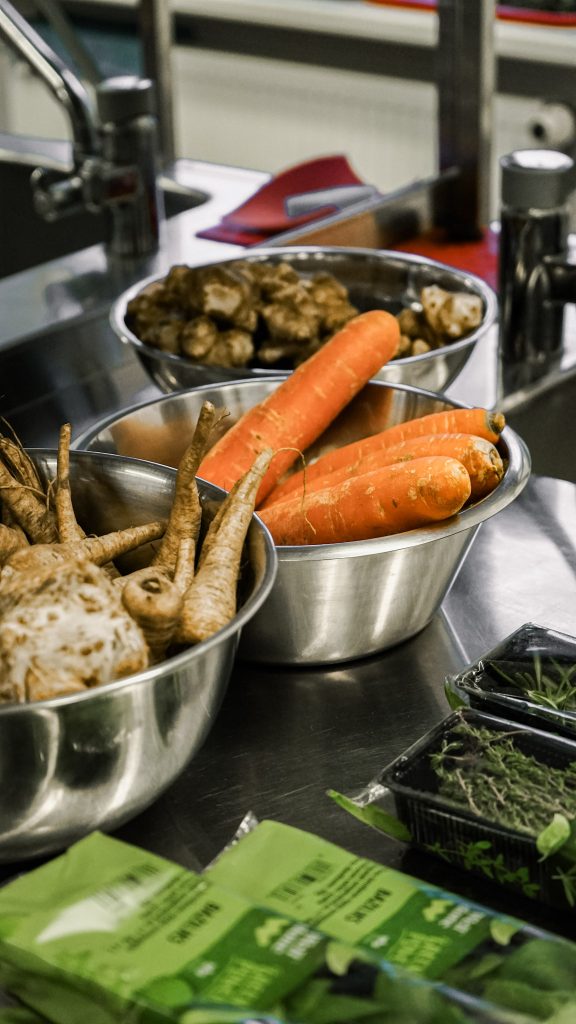 Pēc prezentācijām dalībnieki ļāvās praktiskajai meistarklasei kopā ar Bērnu klīniskās universitātes slimnīcas šefpavāru Jēkabu Naumovu. Īpašs uzsvars šajā meistarklasē bija tieši sakņu pagatavošanai, lai tās padarītu pievilcīgas skolēniem, tāpēc kopīgi tika gatavoti krāsnī cepti sakņu dārzeņi – topinamburi, pastinaki, seleriju saknes un burkāni – , kā arī baltās zivs-vistas gaļas bumbiņas un baltās šokolādes muss ar citronu krēmu.
