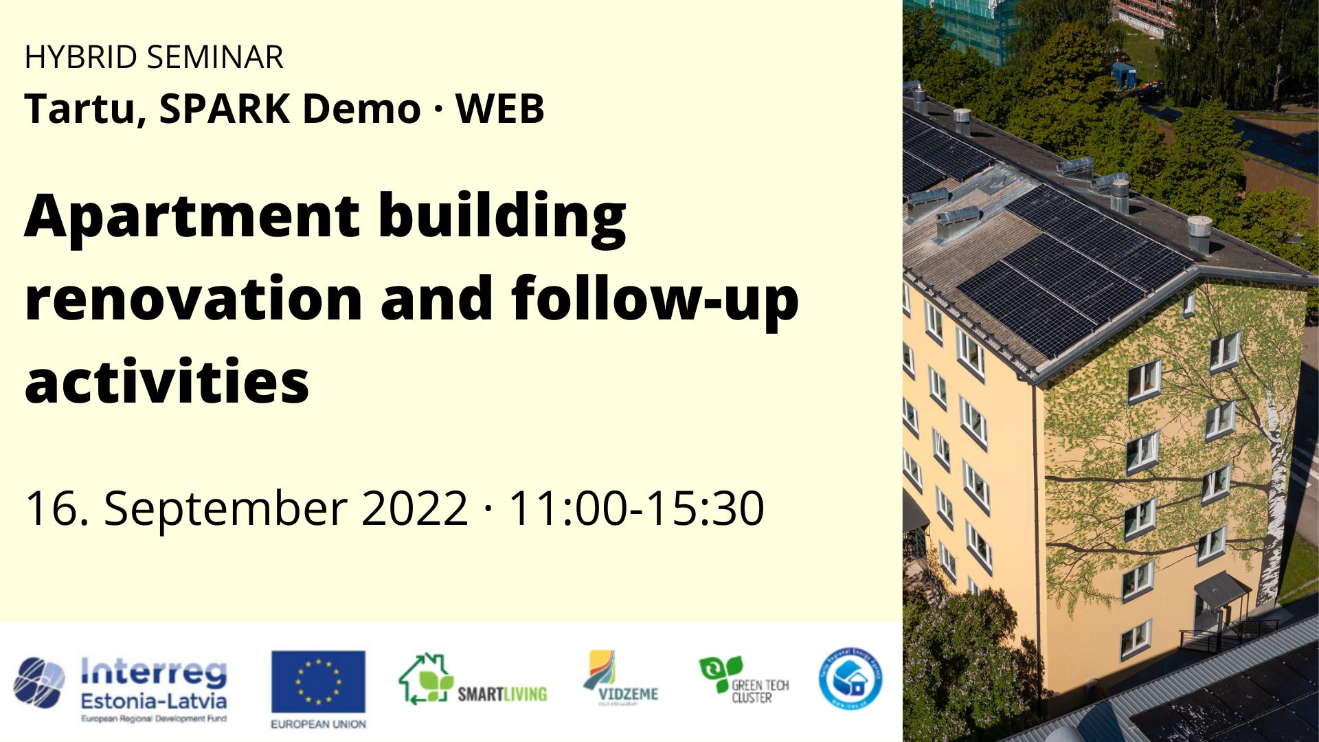 Aicinām interesentus š.g. 16. septembrī apmeklēt Tartu, lai piedalītos vērtīgā, diskusijas rosinošā seminārā “Daudzdzīvokļu namu renovācija un pēc-renovācijas aktivitātes”. Pasākumā tiks aplūkotas gan priekšrocības, gan izaicinājumi, kas sagaidāmi, renovējot daudzdzīvokļu ēkas, kā arī eksperti pastāstīs par tām lietām, ar kurām jārēķinās pēc tam, kad ēkas renovācijas darbi ir pabeigti. Semināra darba valoda – angļu. Semināru varēs skatīties arī tiešsaistē interneta vidē.