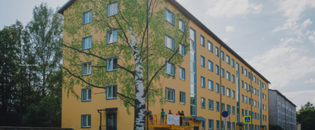 Attēlā: Viena no projekta SmartEnCity ietvaros renovētajām daudzdzīvokļu ēkām Tartu, Igaunijā (Avots: https://mobilitylab.ut.ee/smartencity/)