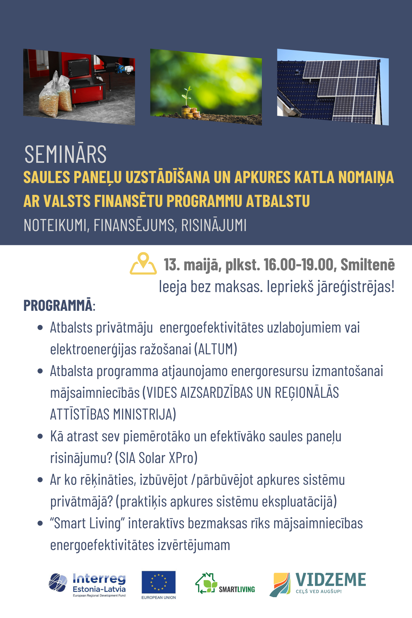 Piektdien, 13. maijā, plkst. 16.00, Smiltenē (Gaujas ielā 1, Smiltenes kultūras centra telpās) Vidzemes plānošanas reģions organizē bezmaksas semināru “Saules paneļu uzstādīšana un apkures katla nomaiņa ar valsts finansētu programmu atbalstu. Noteikumi, finansējums, risinājumi”.