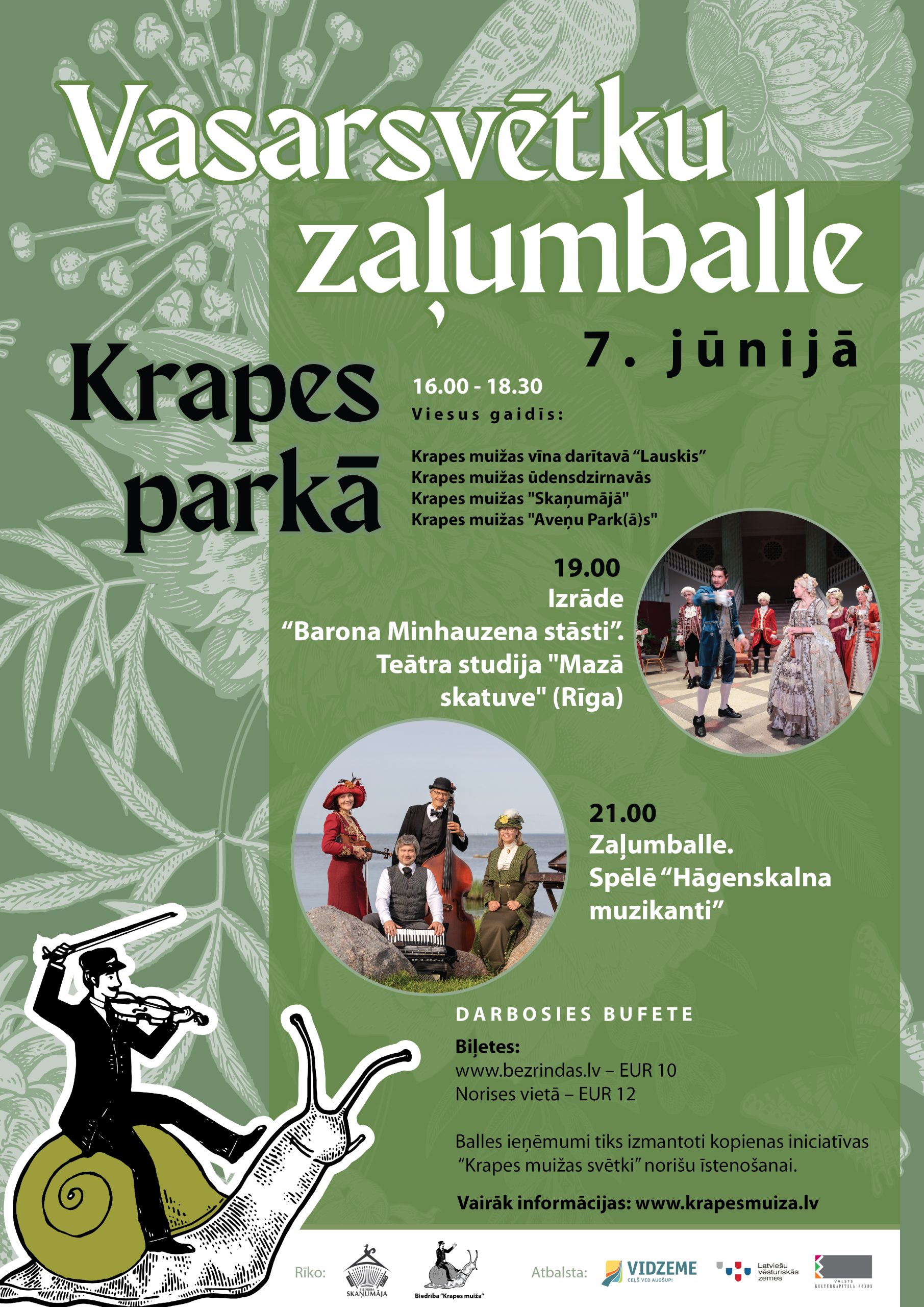 Krapes muižas parkā šovasar atdzims sena tradīcija – teātra izrāde un zaļumballe Vasarsvētkos, kā tas vēsturiski bijis jau 19. gadsimtā. Vēstures avotos minēts, ka balles šajā apvidū tika rīkotas kādā no muižas vecsaimniecībām – kurai nu pievilcīgāka zaļumu birze. Ballē mijusies dancošana pie labas ragu mūzikas, dziedāšana un teātra mizanscēnas, kļūstot par vienu no svarīgākajiem sabiedriskās dzīves notikumiem lauku sabiedrībā.