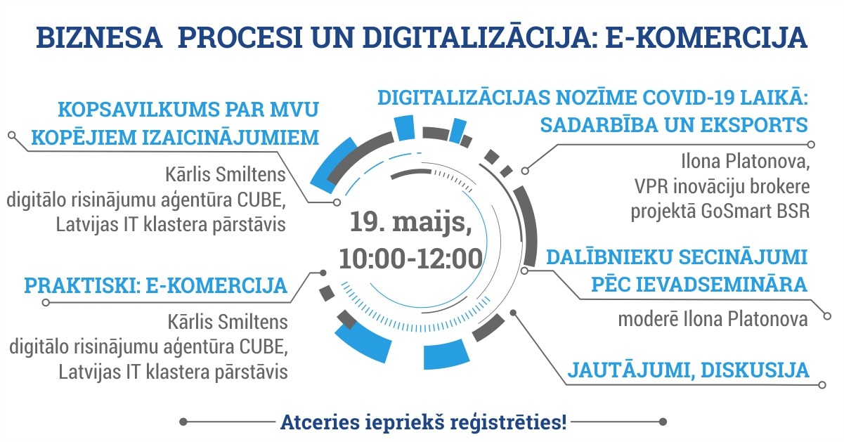 Vidzemes plānošanas reģions turpina digitalizācijas pasākumu ciklu un izsludina nākamo semināru “Biznesa procesi un digitalizācija: e-komercija”, kas notiks 19. maijā plkst. 10:00-12:00 tiešsaistes platformā “Zoom”. Lai reģistrētos semināram, lūdzam aizpildīt anketu (pieejama šeit).