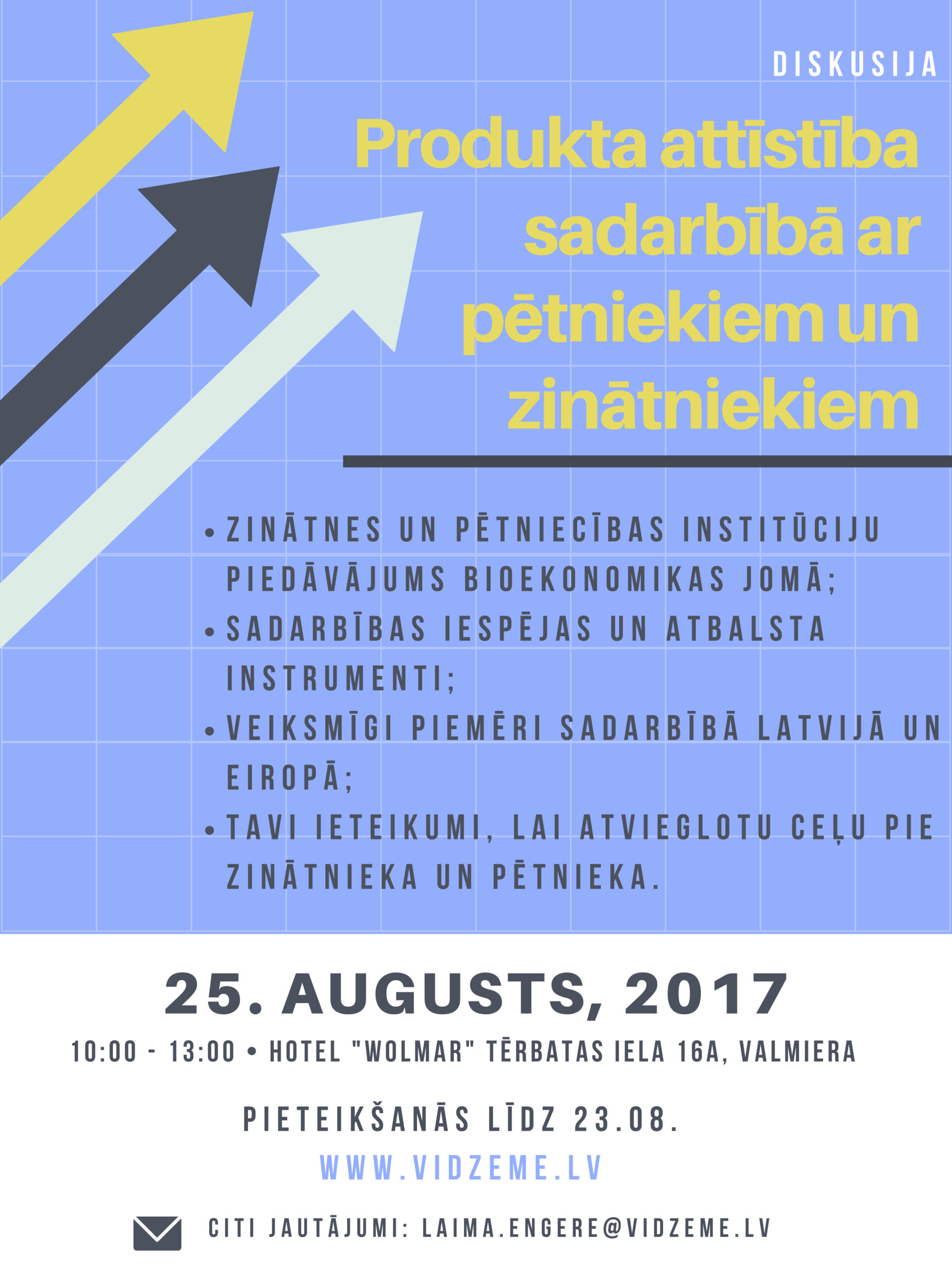 Ja arī Jūsu uzņēmumam interesē sadarbības iespējas ar zinātniekiem un pētniekiem, aicinām Jūs piedalīties diskusijā “Produkta attīstība sadarbībā ar pētniekiem un zinātniekiem”, kas norisināsies šī gada 25. augustā Hotel “WOLMAR”, Tērbatas iela 16A, Valmiera no plkst. 09:30.