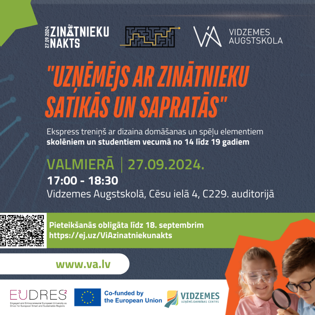 Vidzemes Augstskolas (ViA) organizētās Eiropas Zinātnieku nakts ietvaros aicinām skolēnus un studentus vecumā no 14 līdz 19 gadiem apmeklēt eksprestreniņu ar dizaina domāšanas un spēļu elementiem “Uzņēmējs ar zinātnieku satikās un sapratās”.