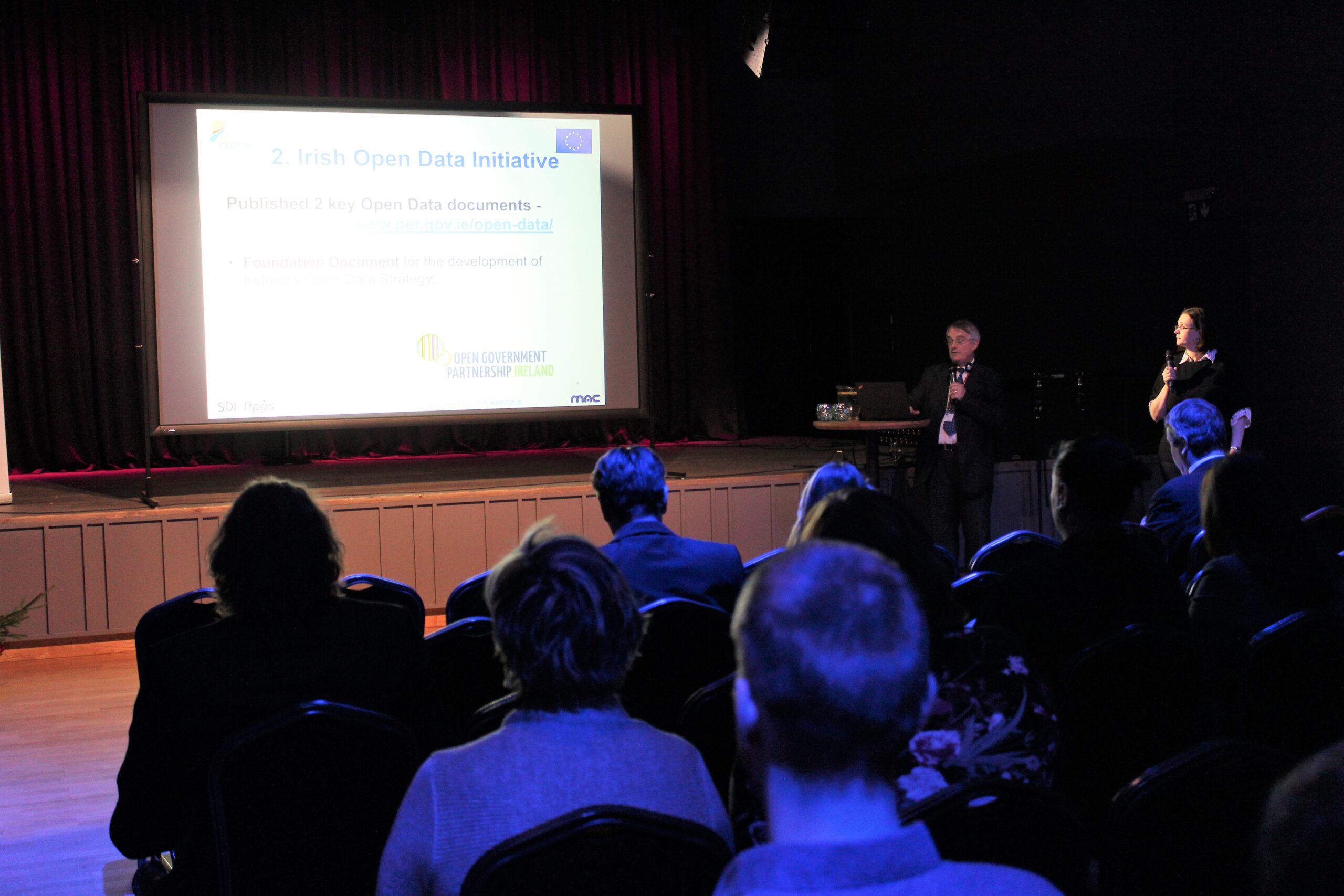 Vides aizsardzības un reģionālās attīstības ministrijas pārstāvis Toms Ceļmillers iepazīstināja klātesošos ar atvērto datu situāciju Latvijā un ministrijas plāniem veidot vienotu atvērto datu portālu. Viņš arī uzsvēra pamatprincipus, kas jāņem vērā publicējot datus – tiem jābūt viegli atrodamiem, lietojamiem un saprotamiem. Turpinājumā teorētiskās kibernētikas doktors no Čehijas Karels Čarvats (Karel Charvat) prezentēja projektu “SDI4Apps” un divus no tā pilotrisinājumiem – zemes izmantojuma veidus un tūrisma interešu punktus, demonstrējot projekta laikā paveikto. Projekta ietvaros ir izdevies integrēt dažādas Eiropas atvērto datu kopas, lai lietotājs varētu izmantot atšķirīgus datus vienotu risinājumu radīšanā. Savukārt pirmo konferences daļu noslēdza Latvijas Ģeotelpiskās informācijas aģentūras (LĢIA) pārstāvis Arvīds Ozols, iepazīstinot klātesošos ar LĢIA lomu atvērto datu jomā un pieejamām datu kopām. LĢIA plānos ir izveidot mājaslapas sadaļu, kurā vienuviet būtu pieejami visi LĢIA rīcībā esošie atvērtie dati.