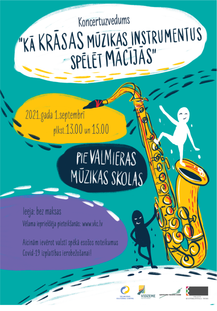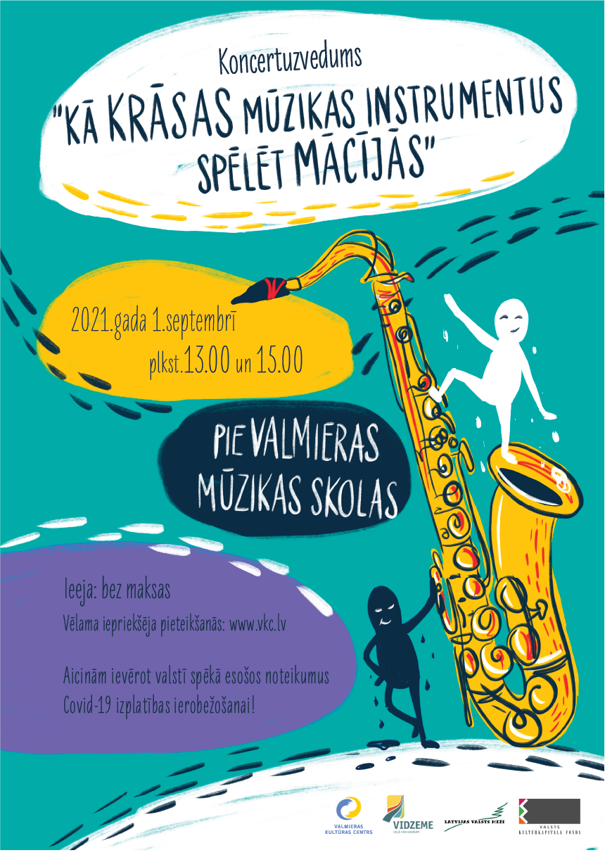 1. septembrī plkst. 13.00 un plkst. 15.00 pie Valmieras Mūzikas skolas notiks koncertuzvedums bērniem “Kā krāsas mūzikas instrumentus spēlēt mācījās”. Koncertuzvedums tapis Valmieras Kultūras centra īstenotā projekta ietvaros ar Vidzemes plānošanas reģiona un Valsts Kultūrkapitāla fonda finansiālu atbalstu.