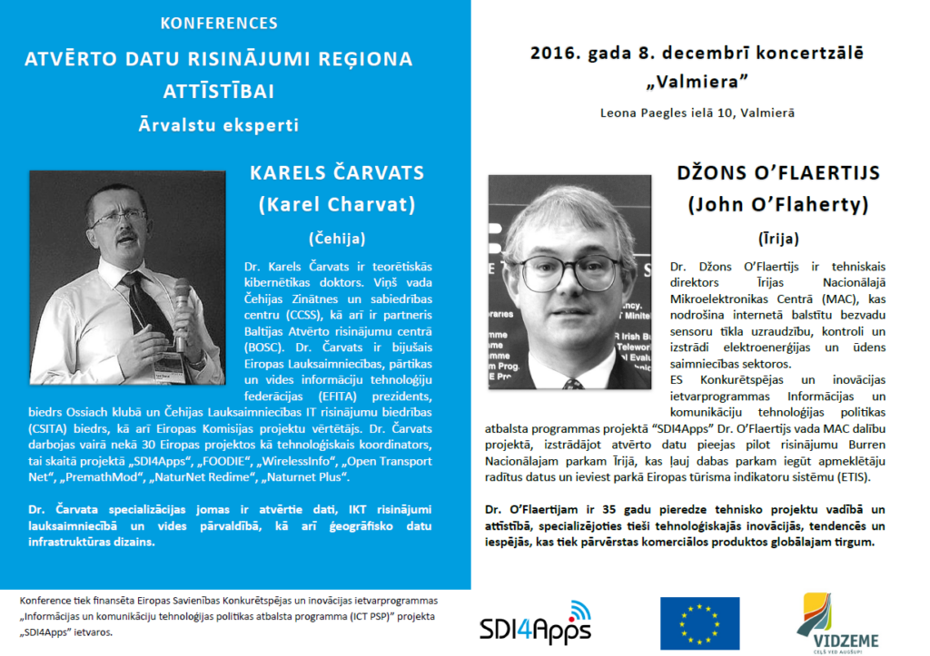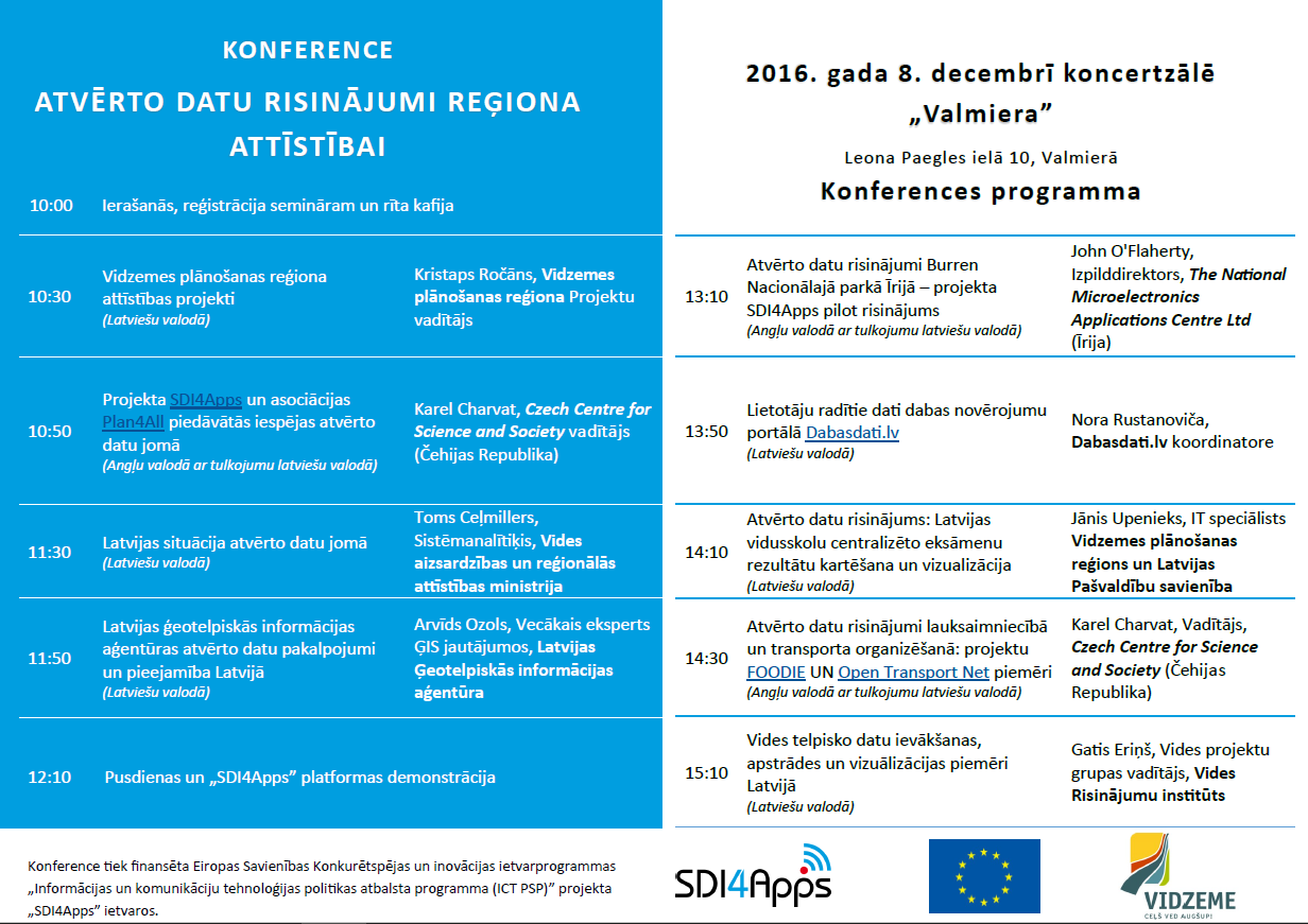 Konference tiek rīkota projekta “SDI4Apps” ietvaros, un pusdienu pārtraukumā varēs tuvāk iepazīties ar projektā izstrādāto mākoņa platformu. Platforma ļaus lietotājiem gan publiskajā, gan privātajā sektorā izstrādāt jaunas lietojumprogrammas, izmantojot Eiropas atvērtos datus.