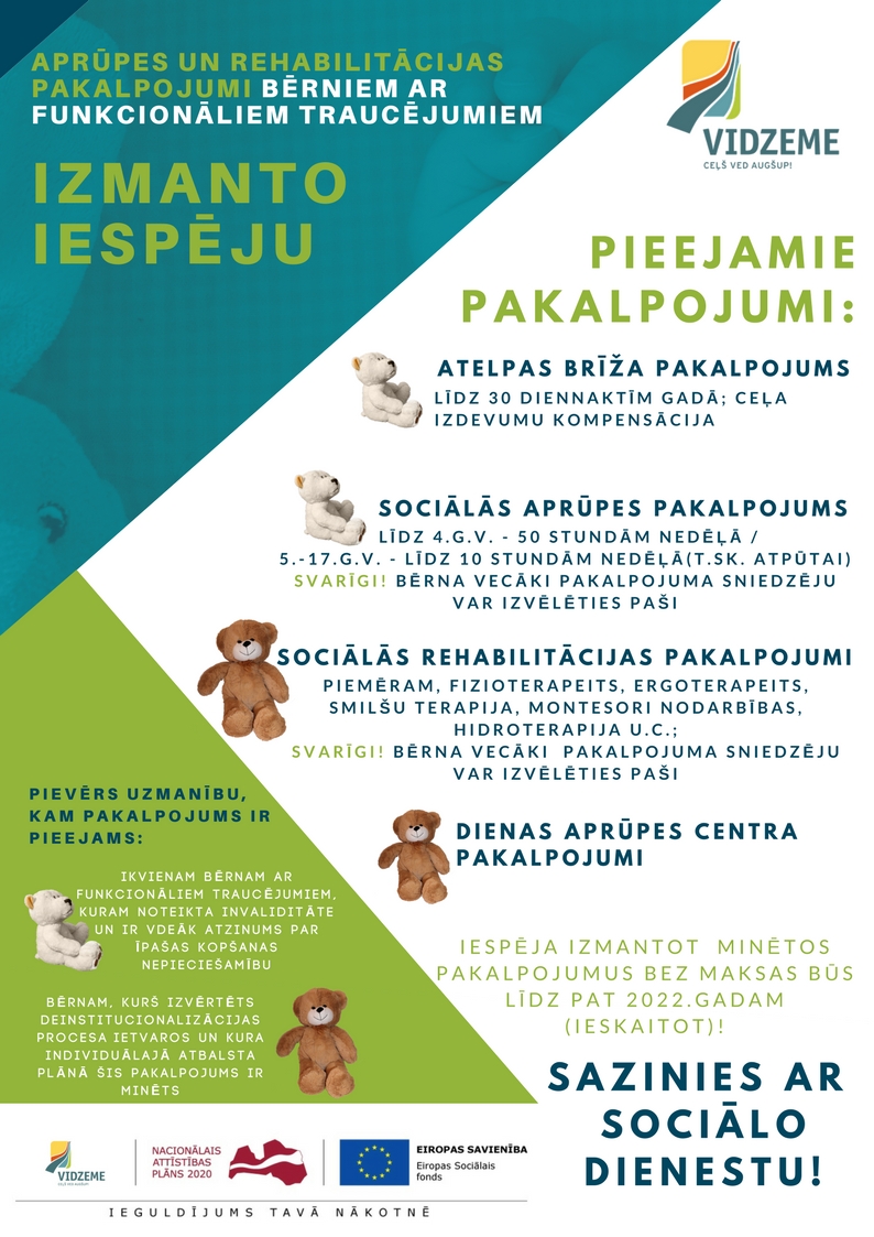 Vidzemē aicina vecākus, kuriem ir bērni ar funkcionāliem traucējumiem (un kuriem noteikta invaliditāte), pieteikties bezmaksas sociālo pakalpojumu saņemšanai savās pašvaldībās