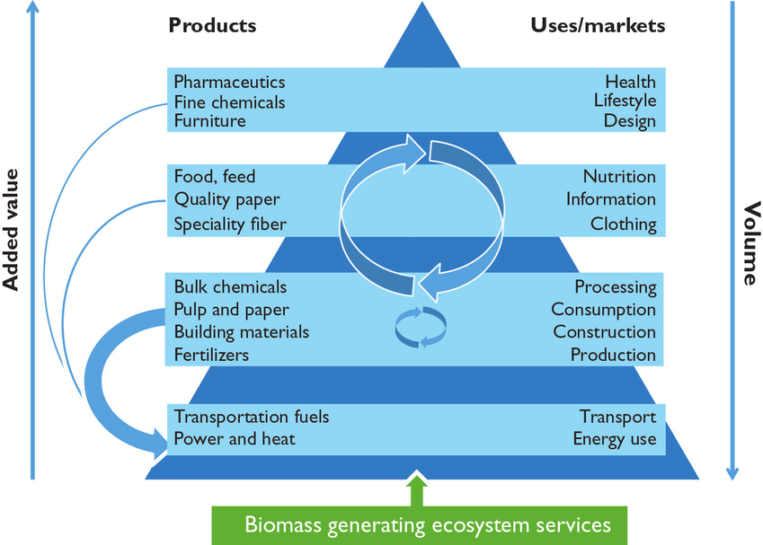 Bioekonomika piedāvā prakses, kā iegūt lielāku vērtību un ekonomisko ieguvumu no 1 hektāra vai 1 bioloģisko resursu vienības. Domājot par šo resursu gudru pārvaldību, būtu jāņem vērā biomasas vērtības piramīda (Attēls Nr.2.). Viszemāko vērtību iegūst, ja sadedzina biomasu, lai saražotu elektrību un siltumu. Vērtība ir zema, jo neizmantojam visu materiāla potenciālu. Lai iegūtu augstāku produkta vērtību un ekonomisko labumu, jācenšas tiekties uz piramīdas augstākā līmeņa produktiem. Tie ir veselību veicinoši produkti, pārtikas sastāvdaļas, dzīvnieku barības sastāvdaļas un produkti, kurus šobrīd ražojam no fosilajiem resursiem.