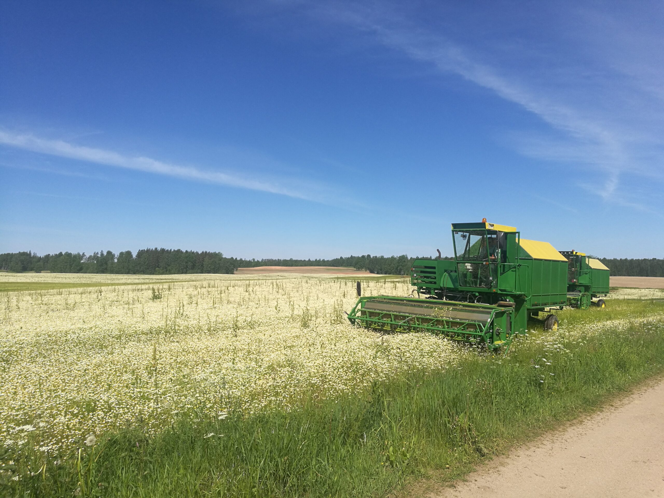 Attēls Nr.3. SIA “Field and Forest” bioloģiski audzēto kumelīšu lauks, kurā augi tiek novākti ar pašu būvētu kombainu. Foto: SIA “Field and Forest”.