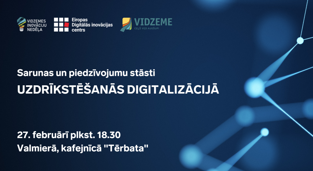 27. februārī plkst. 18.30 Valmierā, kafejnīcā “Tērbata”, notiks sarunu un pieredzes stāstu vakars “Uzdrīkstēšanās digitalizācijā”. Pasākumā būs iespēja dzirdēt par digitalizācijas iespējām un izaicinājumiem – Kāpēc digitalizācija? Kurš risinājums? Vai tas bija tas, ko gaidīju? Ko tālāk? Un vēl daudz citu patiesu stāstu par dažādām pieredzēm ceļā uz digitalizāciju.