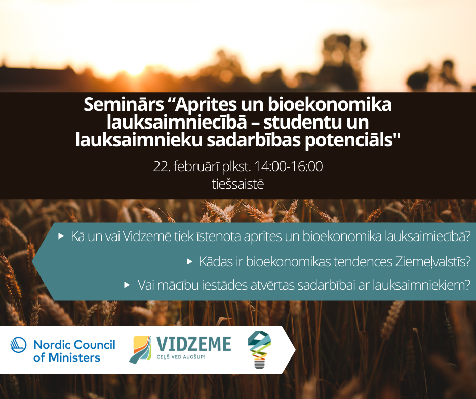 Radīsim atbildes uz jautājumiem: Kādas iespējas studentiem mācību procesā ir iesaistīties reālu risinājumu izstrādē? Vai mācību iestādes atvērtas sadarbībai ar lauksaimniekiem? Par to mums pastāstīs Vidzemes augstskolas akadēmiskā prorektore, profesore Maira Leščevica. Savukārt Ziemeļvalstu Ministru padomes biroja Latvijā padomniece Maija Kāle iepazīstinās ar aprites, bioekonomikas un digitalizācijas tendencēm Ziemeļvalstīs. SIA “Aloja-Starkelsen” Izpilddirektors un Latvijas pārtikas bioekonomikas klastera valdes priekšsēdētājs Jānis Garančs dalīsies ar uzņēmuma pieredzi un skatījumu par aprites ekonomiku no ilgtspējīgas pārtikas izejvielu ražošanas perspektīvas.