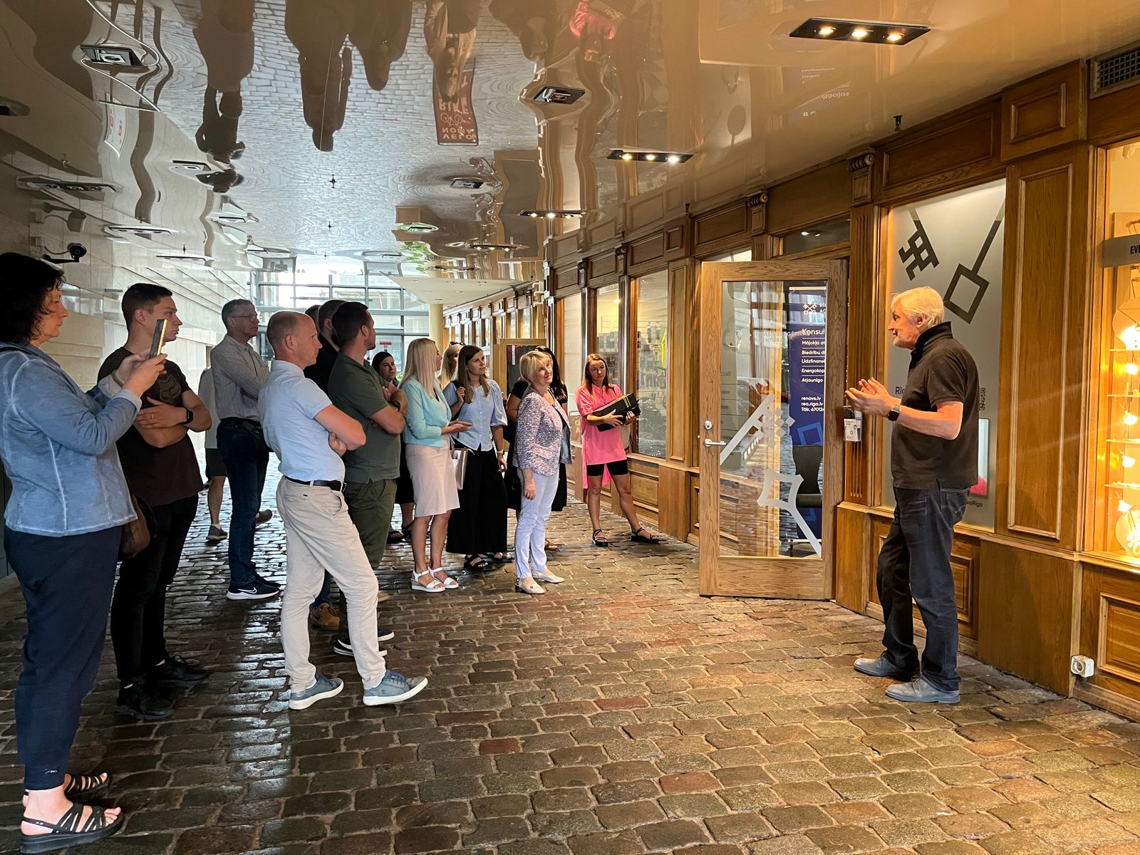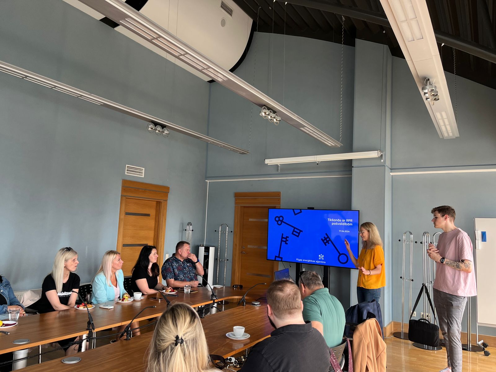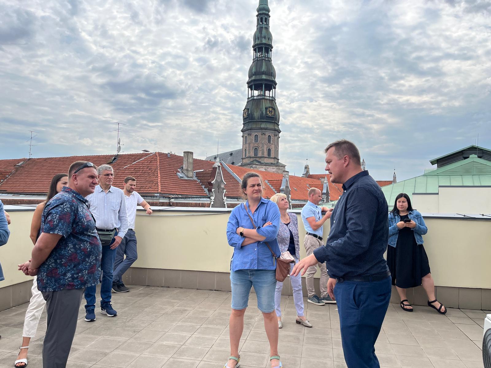 Pirmā pieturvieta bija Rīgas dome, kur ciemos mūs uzņēma Rīgas enerģētikas aģentūra (REA). Rīgas pašvaldība 2020. gadā pievienojās Eiropas “Pilsētu mēru pakta” iniciatīvai, uzņemoties saistības ne tikai sasniegt nozīmīgus CO2 emisiju samazinājuma mērķus līdz 2030. gadam, bet arī panākt klimatneitralitāti. Turklāt Rīga ir viena no 100 Eiropas Savienības pilsētu misijas “100 klimatneitrālas un viedas pilsētas” dalībniecēm. REA direktors Jānis Ikaunieks uzsvēra, ka Rīgas pašvaldībā ir liels skaits ēku, kuras ir vecākas par 30 gadiem, un vismaz 6000 ēkas ir jāatjauno. Lai veicinātu daudzdzīvokļu ēku atjaunošanu, kopš 2021. gada darbojas energoefektivitātes informācijas centrs www.renove.lv, kas sniedz informatīvo atbalstu rīdziniekiem ceļā uz daudzdzīvokļu ēku atjaunošanu. REA eksperti piedalās arī iedzīvotāju kopsapulcēs, kur sniedz informāciju par konkrētās ēkas enerģijas patēriņu, ieteicamajiem ēkas atjaunošanas pasākumiem, potenciālo ietaupījumu un izmaksām, kā arī palīdz noteikt nākamos rīcības soļus.