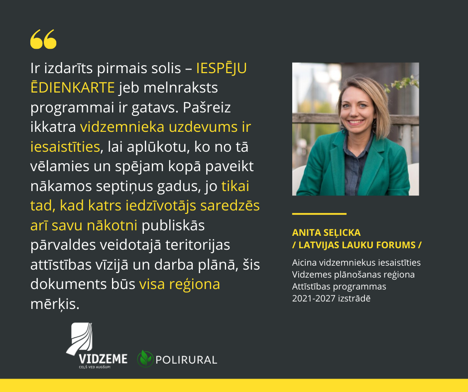 Mūsu, iedzīvotāju, uzdevums ir dalīties savā redzējumā par to, kā tas varētu ietekmēt mūsu katra ikdienu, kas mums ir nepieciešams un ko mēs gribētu darīt. Pirmajā darba grupā par identitāti runājām gan par atbalstu kopienu līderiem un demokrātiski ievēlētām ciemu valdēm, kaimiņu būšanu, gan praktiskām rekomendācijām, ko sagaidām no pašvaldības un kā plānošanas reģions varētu sniegt atbalstu. Ir izdarīts pirmais solis – iespēju ēdienkarte jeb melnraksts programmai ir gatavs. Pašreiz ikkatra vidzemnieka uzdevums ir iesaistīties, lai aplūkotu, ko no tā vēlamies un spējam kopā paveikt nākamos septiņus gadus, jo tikai tad, kad katrs iedzīvotājs saredzēs arī savu nākotni publiskās pārvaldes veidotajā teritorijas attīstības vīzijā un darba plānā, šis dokuments būs visa reģiona mērķis.”