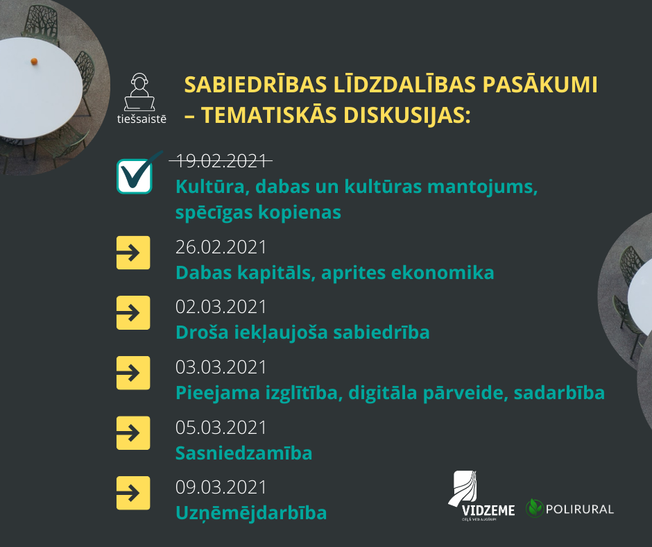 Ar iedzīvotājiem pavisam kopā plānots tikties sešas reizes. Pirmā kopā sanākšana jau veiksmīgi aizvadīta, tajā diskutējot par kultūras, dabas un kultūras mantojuma, kā arī spēcīgu kopienu jautājumiem. Pirmajā organizētajā tiešsaistes pasākumā-diskusijā tikās 85 interesenti ne tikai no Vidzemes, bet visas Latvijas.