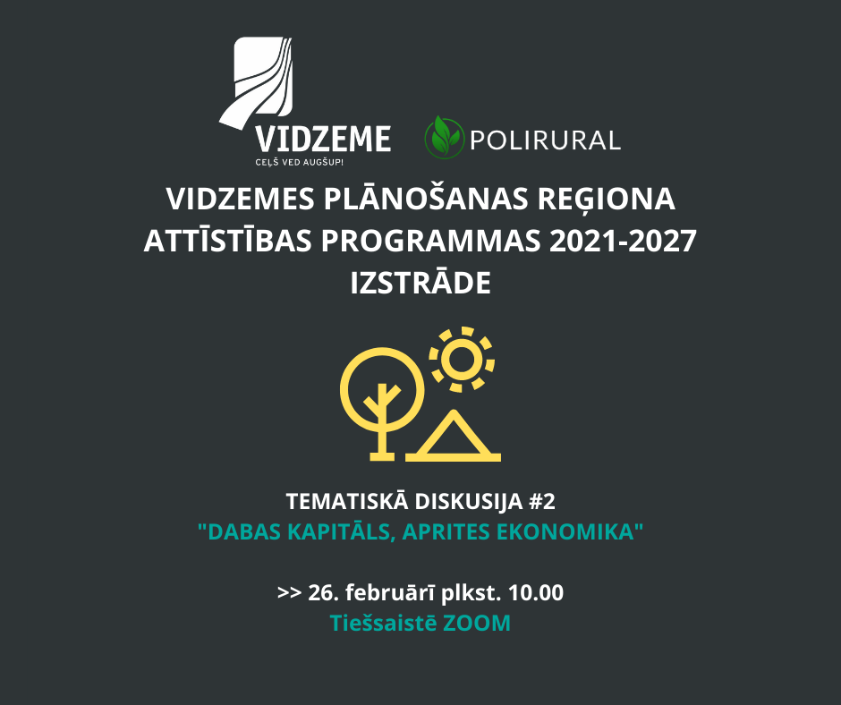 Turpinot uzsākto ieceri – Vidzemes plānošanas reģiona Attīstības programmas izstrādi nākamajiem septiņiem gadiem veikt kopā ar vidzemniekiem – , š.g. 26. februārī plkst. 10.00 tiks organizēta tiešsaistes tematiskā diskusija “Dabas kapitāls, aprites ekonomika”. Tematiskās diskusijas Vidzemes plānošanas reģions (VPR) organizē Attīstības programmas 2021-2027 1. redakcijas projekta publiskās apspriešanas ietvaros.
