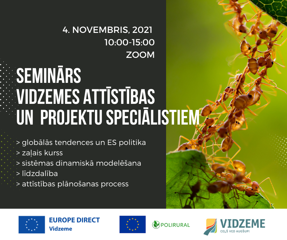 Semināru organizē programmas Apvārsnis 2020 projekts “Sadarbības virzīta nākotnes politika lauku reģioniem un iedzīvotājiem” (PoliRural) sadarbībā ar EUROPE DIRECT Vidzeme.