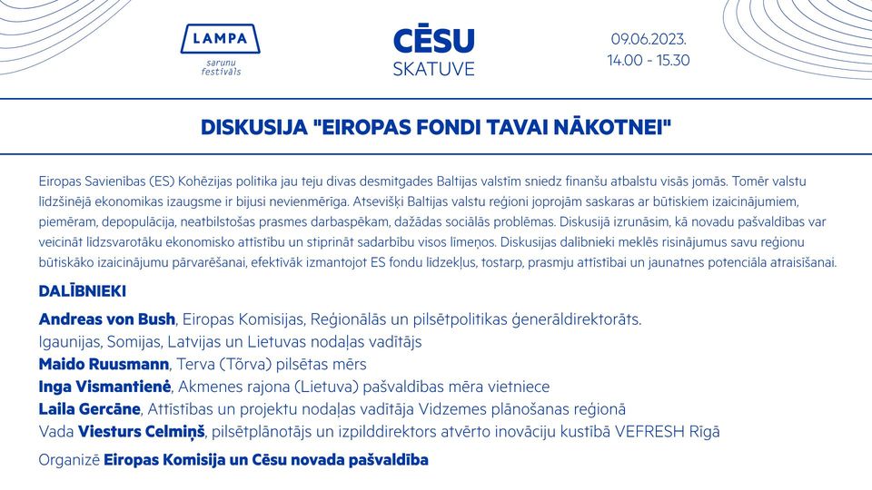 Diskusiju organizē Cēsu novada pašvaldība un Eiropas Komisijas pārstāvniecība Latvijā.