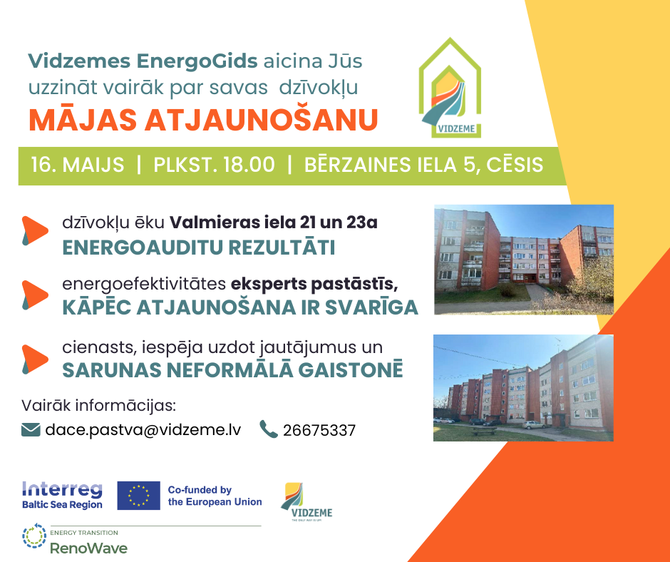 16. maijā plkst. 18.00 Cēsīs, Bērzaines ielā 5, Vidzemes plānošanas reģions (VPR) aicina Cēsu novada iedzīvotājus un citus interesentus uz sarunu par daudzdzīvokļu ēku atjaunošanu. Tikšanās laikā dalībnieki varēs gūt plašāku informāciju arī tieši par savas mājas atjaunošanas iespējām.