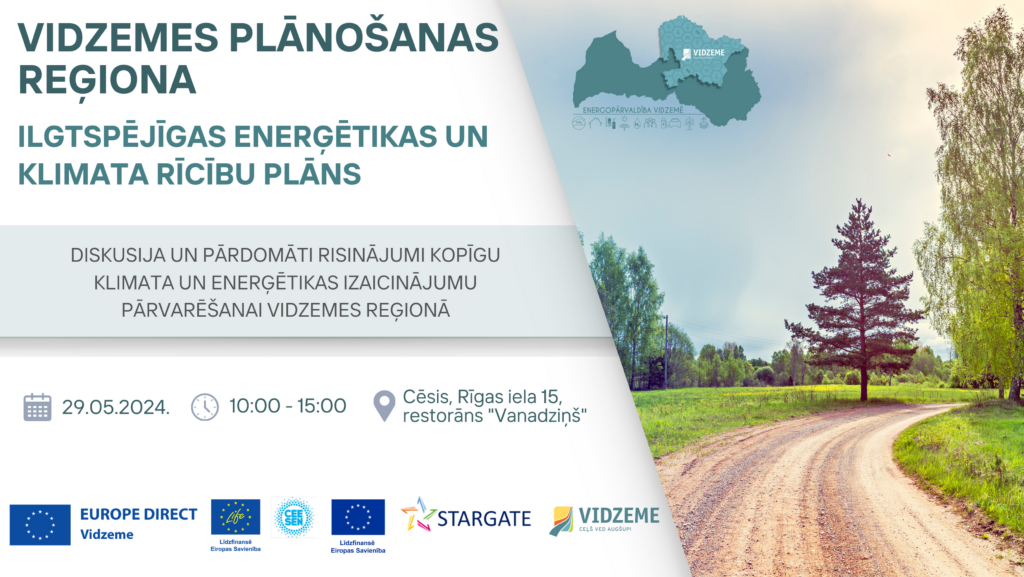 EUROPE DIRECT VIDZEME centrs 29. maijā organizēs pirmo diskusiju par Vidzemes plānošanas reģiona ilgtspējīgas enerģētikas un klimata rīcības plānu. Tajā Vidzemes plānošanas reģiona (VPR) komanda kopā ar laika ziņu redaktoru Tomu Brici vērsīs uzmanību uz šī brīža klimata riskiem Latvijā, kā arī aicinās tās dalībniekus kopīgā sarunā apzināt iespējamos risinājumus, lai tos mazinātu vai novērstu reģiona līmenī.