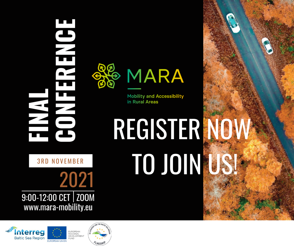 Konference tiek organizēta ar Interreg Baltijas jūras reģiona programmas 2014-2020 atbalstu, projekta “Mobilitāte un pieejamība lauku reģionos – jaunas pieejas mobilitātes koncepciju izstrādei attālos lauku reģionos (MARA)” ietvaros. Uzziņai: www.mara-mobility.eu.