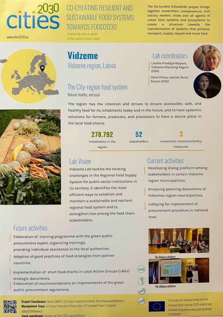 Politikas laboratoriju (policy lab) festivāls deva iespēju VPR un Latvijas lauku forumam (LLF), vēl vienam projekta Latvijas partnerim, iepazīstināt ar līdz šim paveikto to pilotteritorijā – Vidzemes reģionā. Jau iepriekš darīts zināms, ka VPR un LLF šajā projektā strādā pie zaļā publiskā iepirkuma (ZPI) mehānisma maiņas veicināšanas, vietējo iniciatīvu, kas veicina īsu pārtikas piegādes ķēžu attīstību, veidošanas, kā arī pozitīvu pārmaiņu sekmēšanas iedzīvotāju, tai skaitā bērnu, vietējas pārtikas patēriņā. 15 politikas laboratoriju īstenotājiem Eiropā šeit bija iespēja satikties vienuviet, lai diskutētu un dalītos pieredzē, kā norit izmēģinājumu ieviešana konkrētās vietās. Dalībnieki meklēja interešu krustpunktus, kā arī veidoja jaunas sadarbības. Starptautisko partneru iniciatīvas ir saistītas gan ar jaunās paaudzes izglītošanu par veselīgu uzturu, gan pārtikas atkritumu mazināšanu, gan mēģinājumiem īstenot pieeju “Pārtika visiem” – labāks uzturs, labāka veselība, plašāka sociālā iekļaušana un vietējās ekonomikas attīstības sekmēšana, kā arī daudzas citas.