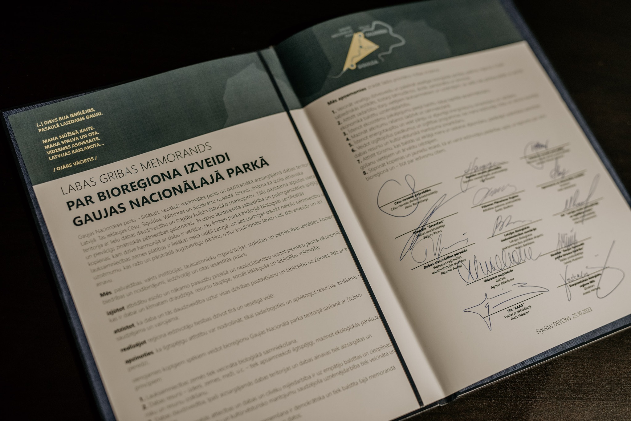 Labas gribas memorandu svinīgā ceremonijā parakstīja 13 institucionālie partneri, kuri cieši saistīti ar memorandā nostiprinātajiem bioreģiona darbības virzieniem: biedrības “Greenfest” valdes priekšsēdētājs Edgars Ricevs, Cēsu novada domes priekšsēdētājs Jānis Rozenbergs, Siguldas novada pašvaldības domes priekšsēdētāja Līga Sausiņa, Valmieras novada pašvaldības domes priekšsēdētāja vietnieks Ričards Gailums, Vidzemes plānošanas reģiona Attīstības padomes priekšsēdētājs Guntis Gladkins, Dabas aizsardzības pārvaldes Vidzemes reģionālās administrācijas direktors Romans Auziņš, Latvijas Lauku konsultāciju un izglītības centra valdes priekšsēdētājs Mārtiņš Cimermanis, Agroresursu un ekonomikas institūta direktore Ineta Stabulniece, Vidzemes Augstskolas rektore Agnese Dāvidsone, Latvijas Bioloģiskās lauksaimniecības asociācijas bioloģiskās lauksaimniecības politikas eksperts Raivis Bahšteins, biedrības “Gaujas Nacionālā tūrisma biedrība” valdes priekšsēdētāja Solvita Muižniece, SIA “ZAAO” valdes priekšsēdētājs Gints Kukainis, kā arī Globālās bioloģisko reģionu alianses izpilddirektors Josteins Hertvigs no Norvēģijas.